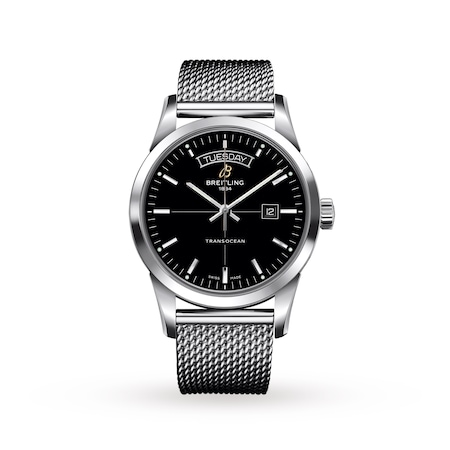 Elegant and sophisticated, this TransOcean Day and Date Watch is defined by the inclusion of a date window at 3 o'clock and a day window at 12 o'clock. The classic, black dial also features slim index markers at every hour and slender hands.