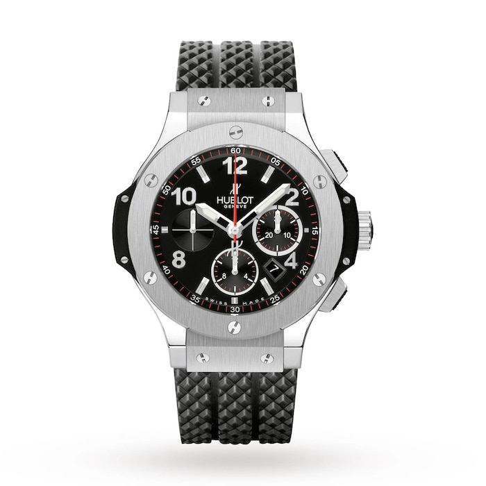 Presented in a 44mm stainless steel case secured with a stand-out, black textured rubber strap, this timepiece is powered by the HUB4100 self-winding chronograph movement, offers a 42-hour power reserve, and is water resistant to 10 bar (100 metres).