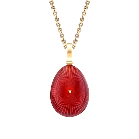 The Heritage Yellow Gold & Red Enamel Egg Pendant features red enamel with starburst guilloché, set in 18 carat yellow gold. The egg pendant is 16mm and comes with an 18 carat yellow gold chain.