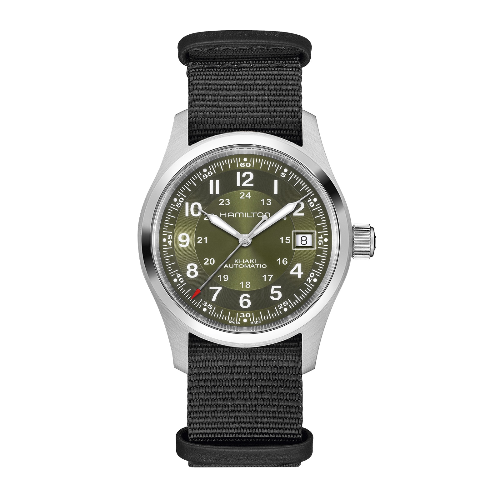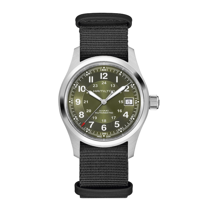 A faithful recreation of its original 1960s forebear, the Khaki Field Auto 38mm features our iconic H-10 automatic movement to deliver an 80-hour power reserve. Inspired by our military roots, this rugged, Swiss-made timepiece features a stainless steel case, green dial with multi-textured finishings and Super-LumiNova®-coated hands for low-light visibility. A durable black NATO strap reinforces its tactical edge, making it ready for action and any occassion.
