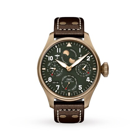 This Men’s Big Pilot’s Watch features a unique and eye-catching olive green dial, organised with a power reserve indicator, luminescent hands and Arabic numerals, a moon phase indicator and a perpetual calendar with displays for the date, day, month and year. Protected by a sapphire crystal glass, secured against displacement by drop in air pressure, the dial is housed by a robust 46mm bronze case and presented on a brown calfskin strap.