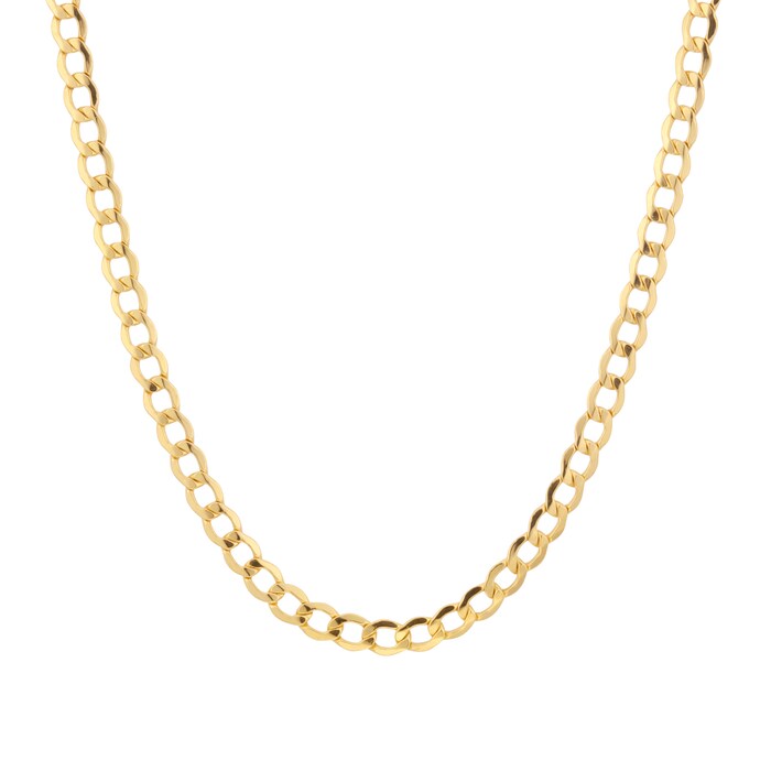 This 20-inch curb chain in 14ct yellow gold offers a harmonious balance of strength and elegance. Its 5.5mm width creates a sleek yet substantial silhouette, complemented by a polished finish that enhances its modern appeal.