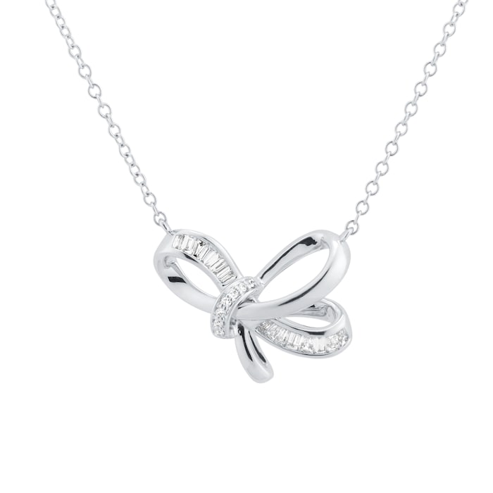 This necklace presents 0.35 carats of round brilliant cut diamonds arranged to highlight the soft curvature of the bow form. Each stone is selected for its clarity and light performance, enhancing the gentle silhouette that characterises the piece.