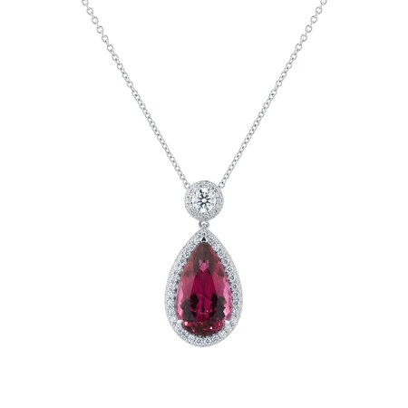 This necklace features a 5.87ct pink tourmaline, framed by 0.79ct of round brilliant cut diamonds in G colour and SI clarity. Set in 18ct white gold, the composition offers a graceful balance of vivid colour and delicate sparkle, ideal for elevated occasions.