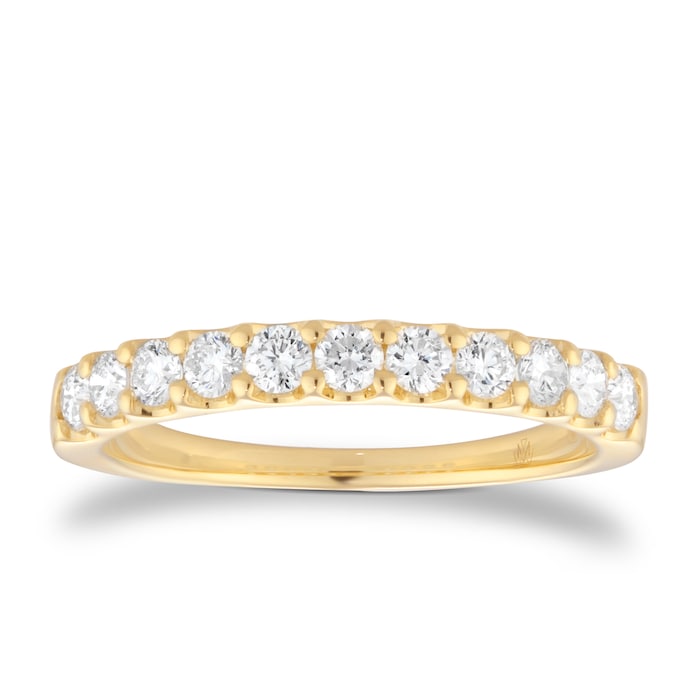 This half eternity ring features 0.50 carats of round brilliant diamonds, claw-set to enhance their natural radiance. The warm tone of 18ct yellow gold complements the stones, creating a harmonious balance of light and form.