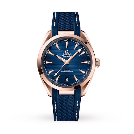 - 41mm 18K Sedna™ gold case paired with a blue, textured rubber strap