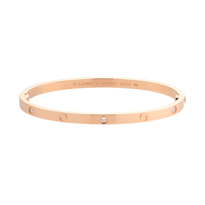 This beautiful Pre-Owned Cartier Love Bracelet is crafted in 18ct rose gold and forms part of the iconic Love collection. The bracelet features 6 round brilliant-cut diamonds alternating with the signature screw motifs along the outer edge, with a total diamond weight of 0.15ct. It is finished with a single screw and hinge fitting. This is the Small version of the Love bracelet, sized at 16, with a gross weight of 17.00 grams.