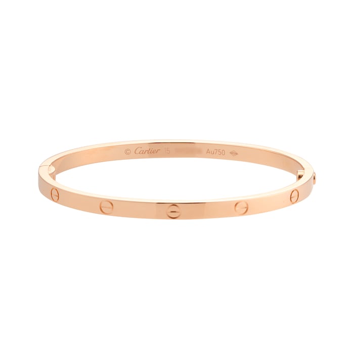 This Pre-Owned Cartier Love Bracelet is crafted in 18ct rose gold and forms part of the iconic Love collection. This smaller model (SM) of the classic Love bracelet features the signature Cartier screw motif design and is finished with a single screw and hinge fitting. The bracelet is a size 18 and has a gross weight of 19 grams.