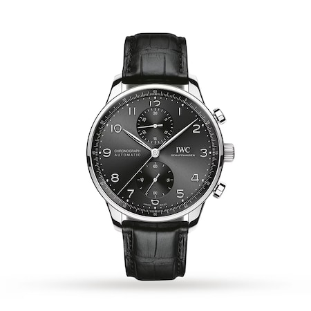 The Portugieser Chronograph is one of IWC Schaffhausen?s most iconic models. With its compact diameter of 41 millimetres, it fits almost any wrist. However, the thin bezel gives one the impression of wearing a significantly larger watch. The clear, functional dial boasts applied Arabic numerals and slender Feuille hands. Printed with a quarter-second scale, the characteristic r?haut not only allows precise reading of the stop time but also reminds us of the Portugieser?s origins as a nautical precision instrument for the wrist. This model features a stainless steel case, a black dial, as well as rhodium-plated hands and appliqu?s; it is fitted with a black alligator leather strap. Inside the sporty-elegant chronograph, the IWC-manufactured 69355 calibre is at work. The robust and precise chronograph movement in classic column-wheel design is visible through a sapphire-glass case back.