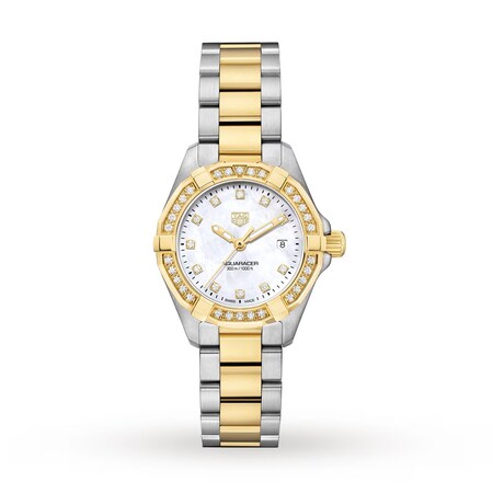This petite, Aquaracer 300 27mm model updates the collection’s sporting pedigree with elegant touches, including a stainless steel and 18K 2N gold-plated case, a refined white mother-of-pearl dial with 11 glistening diamond hour markers, and a further 35 diamonds set in the unidirectional bezel.