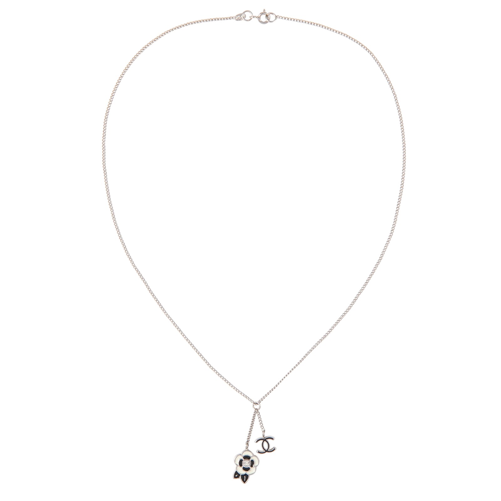 The most desired label in the world. Silver plated snake chain necklace. Features delicate black and white enamel Camelia flower pendant and iconic "CC" charm. Closes with spring ring clasp. Stamped with Chanel authenticity mark and dated 05. There are many suggestions as to why the Camellia was Coco Chanel's favourite flower. One was that Coco Chanel was said to have been deeply moved by Sarah Bernhardt's performance of "Lady of the Camellias" from a very young age. Size 41 cm