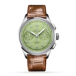 This 41mm timepiece makes a statement of elegance with its iconic round case and contrasting, brown alligator leather strap.