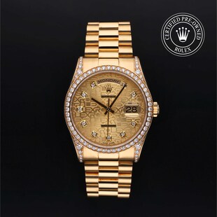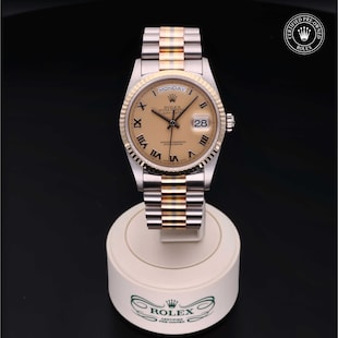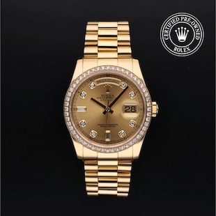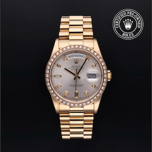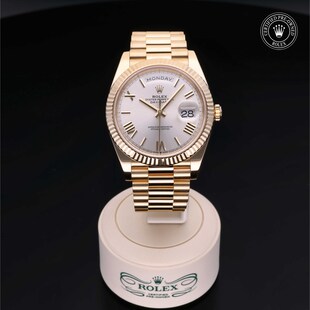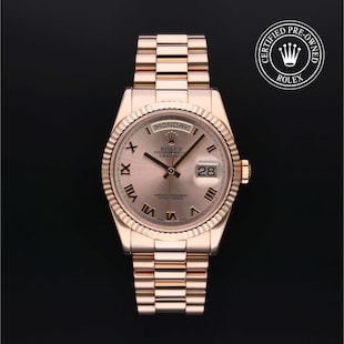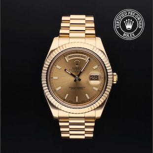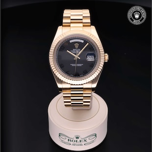 The Oyster Perpetual Day-Date, available only in 18 ct gold or 950 platinum, embodies the essence of Rolex prestige and excellence.