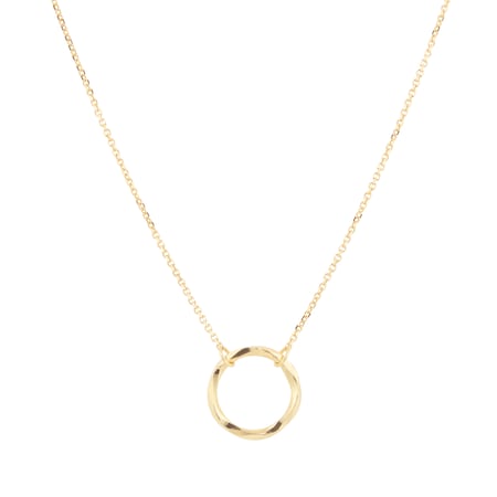 This fluid circle pendant is formed in 18ct yellow gold, enhanced with diamond-cut detailing that adds subtle brilliance. Its open form and graceful curvature evoke a sense of movement and lightness, making it a versatile piece for both everyday wear and elevated occasions.