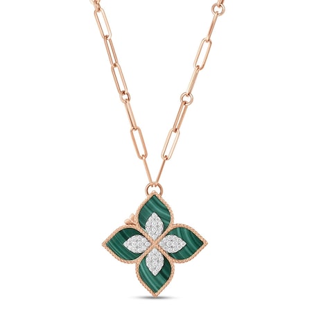Malachite illuminates this flower pendant by Roberto Coin, featuring 18ct rose gold, Diamonds and the uniqueness of a handmade jewel.